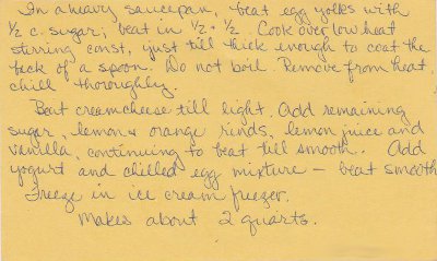 This sounds so yummy and cold. I am intrigued by the use of lemon and orange rind. I think if I was making this ice cream I would use the zest from fresh lemon and orange rinds, only I would probably add more of them than this recipe calls for. Instead of lemon juice, I would squeeze some fresh orange juice (and include the pulp) ...